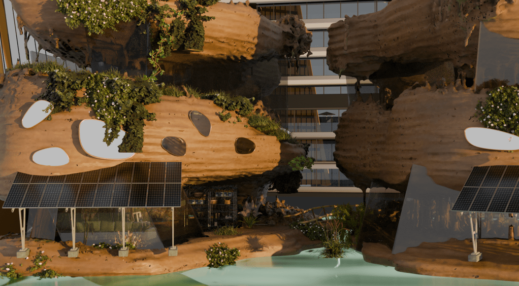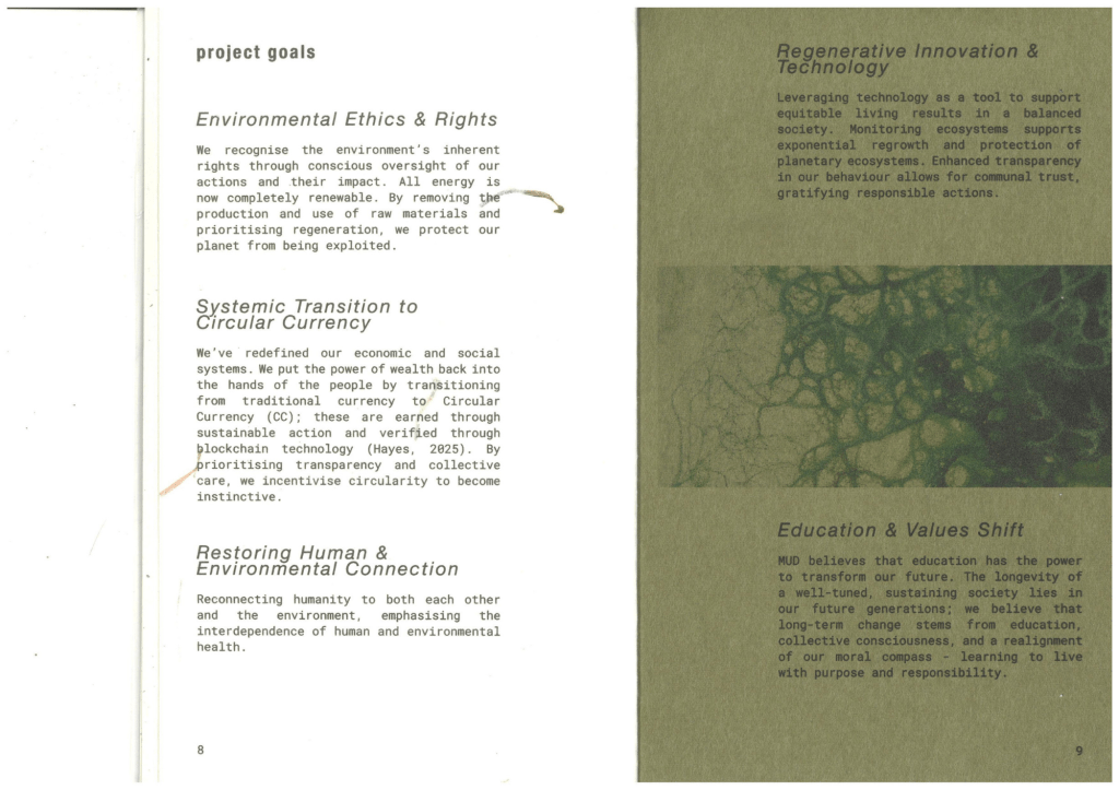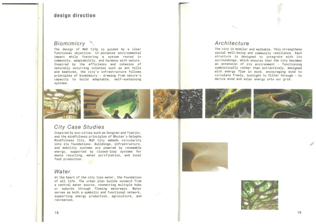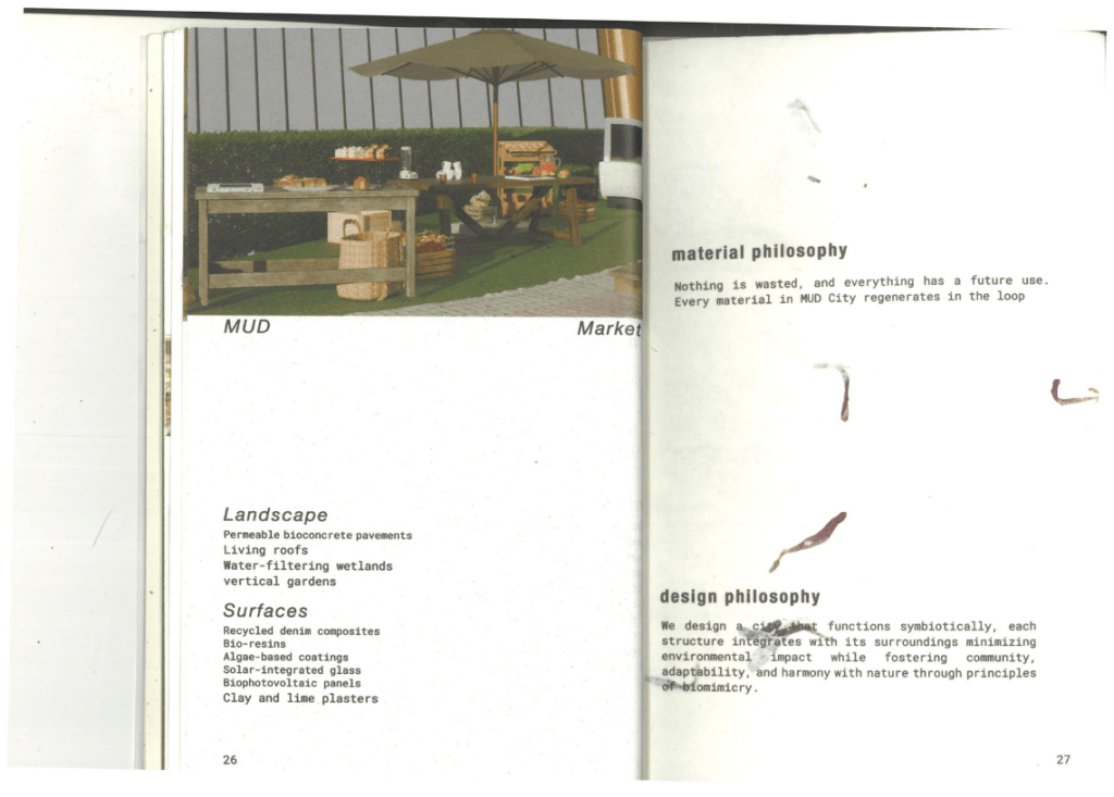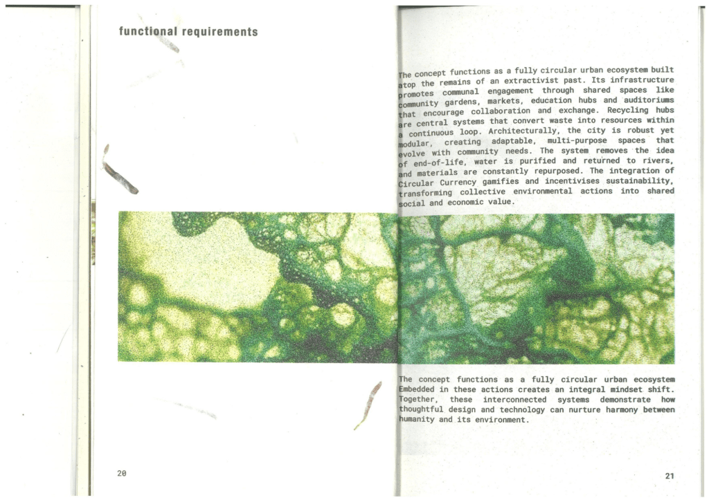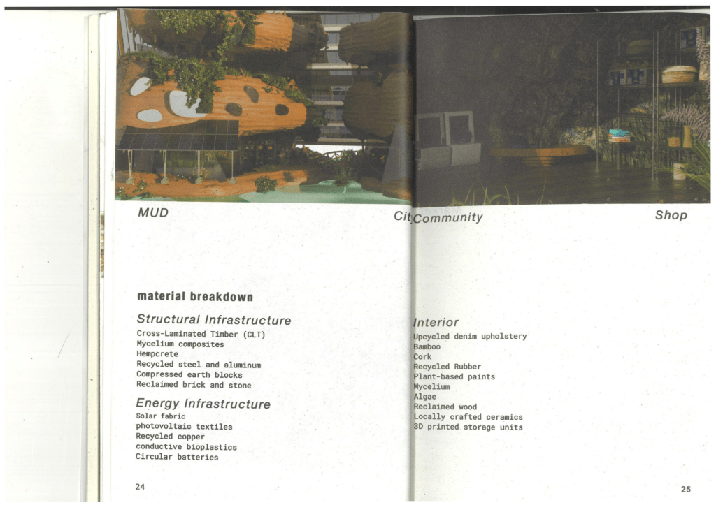 Using futuring research and insights drawn from current geopolitical and cultural zeitgeists, we designed a speculative utopian city where circular systems shape everyday life. The concept draws inspiration from emerging city models such as Gelephu Mindfulness City and theoretical frameworks including eco-socialist thinking, which repositions sustainability as a collective, systemic responsibility rather than an individual burden.