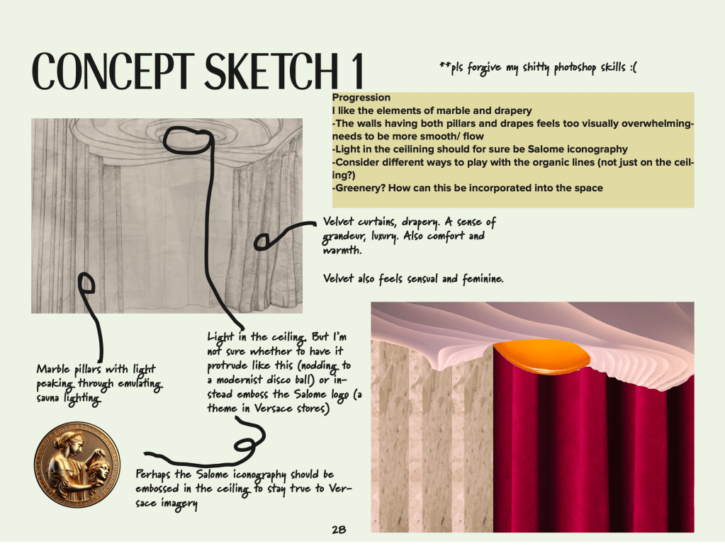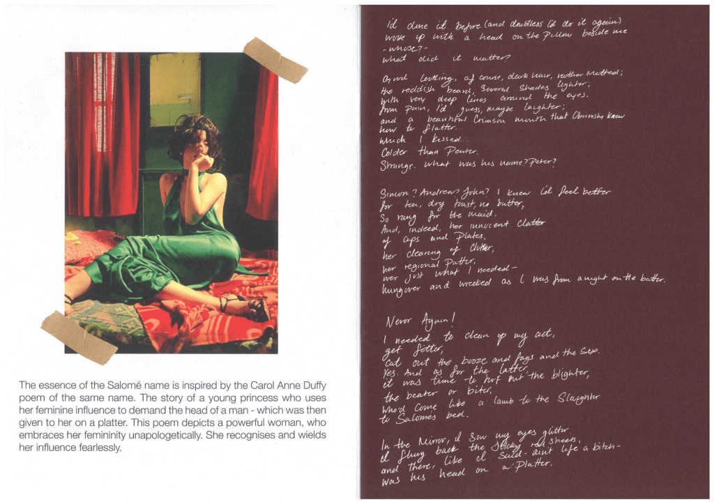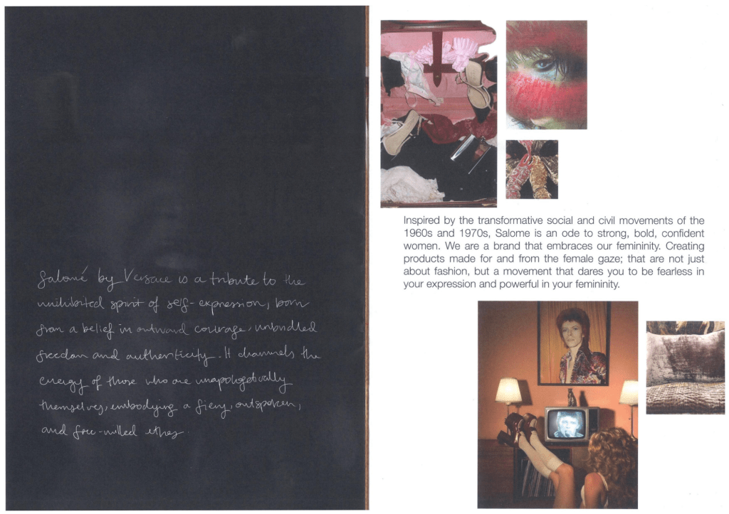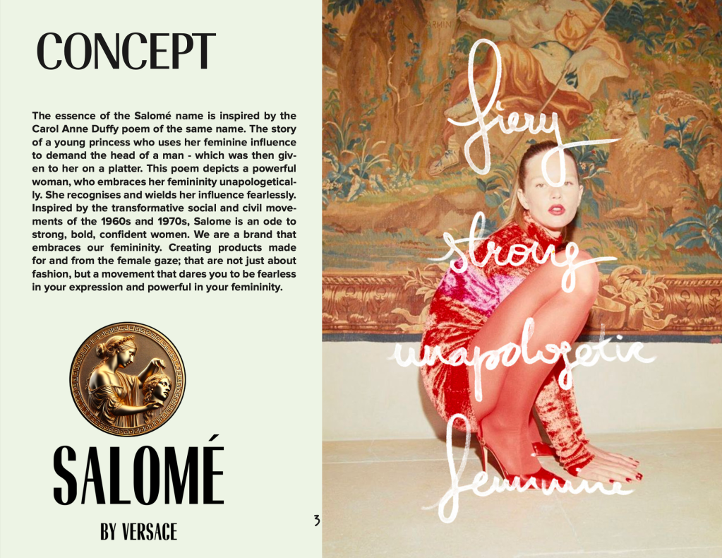 Salomé is a denim sub-brand developed for Versace, inspired by the house’s archival opulence, femininity, and theatrical glamour. The concept draws from the story of Salomé, reimagining unapologetic feminine power through the female gaze.