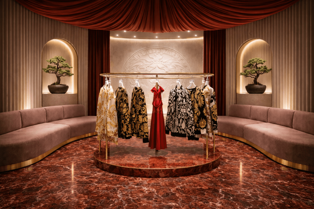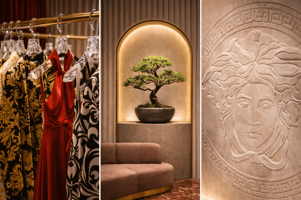 Drawing from the grand, opulent Versace of the past and the transformative social movements of the 1960s and 1970s, the brand reframes denim through the female gaze. The accompanying store space is designed as an immersive pause in time: warm, plush, and theatrical.